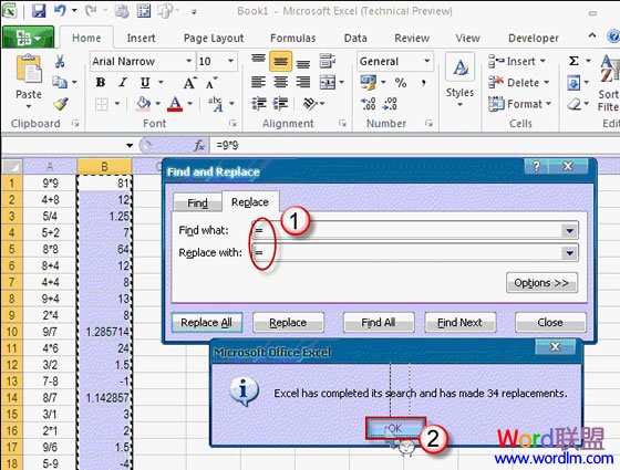 在“查找”框中输入“=”,“替换”框中也输入“=”,“确定”。